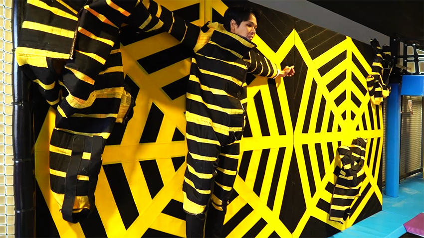 特制的衣服,通過蹦床的彈力,可以粘貼在覆蓋有魔術貼的墻壁上,從而實現“飛檐走壁”的體驗效果。
