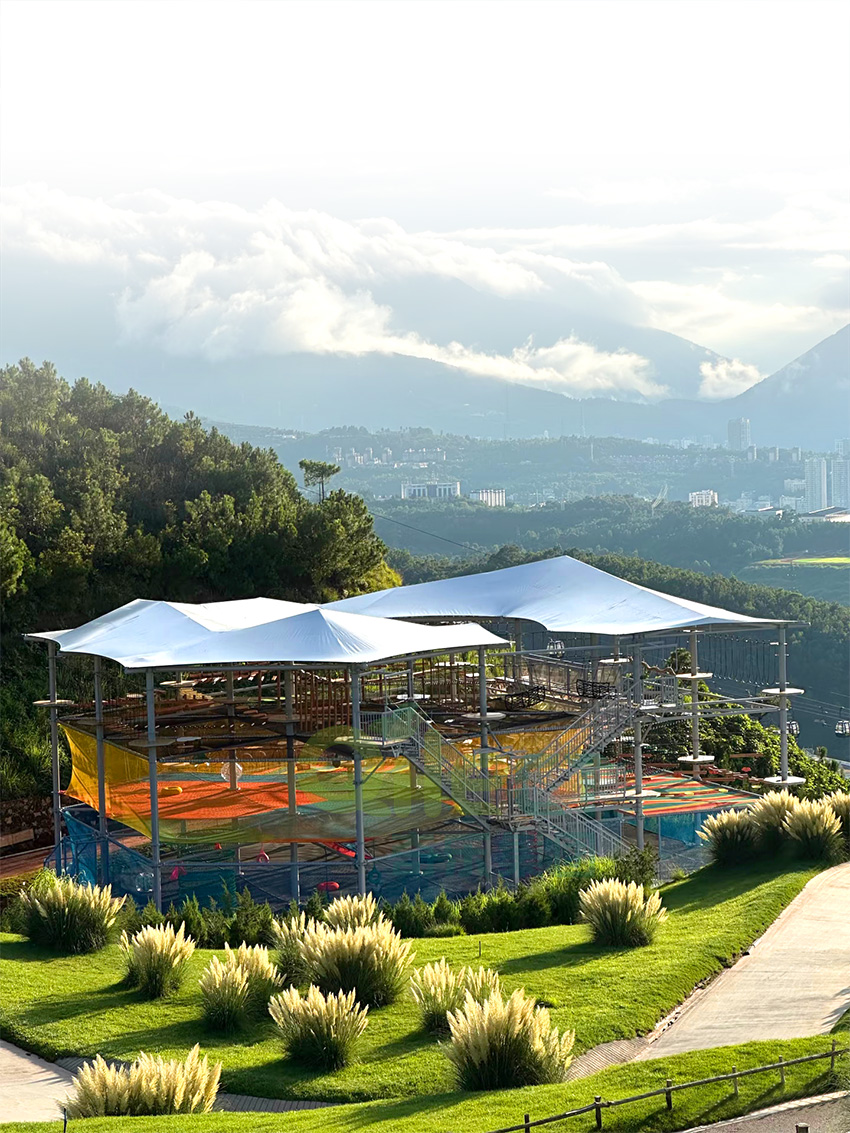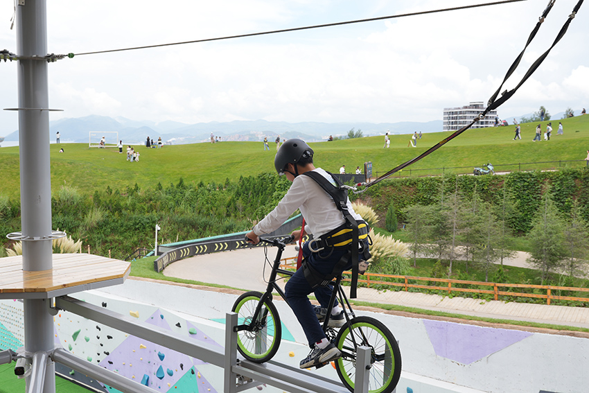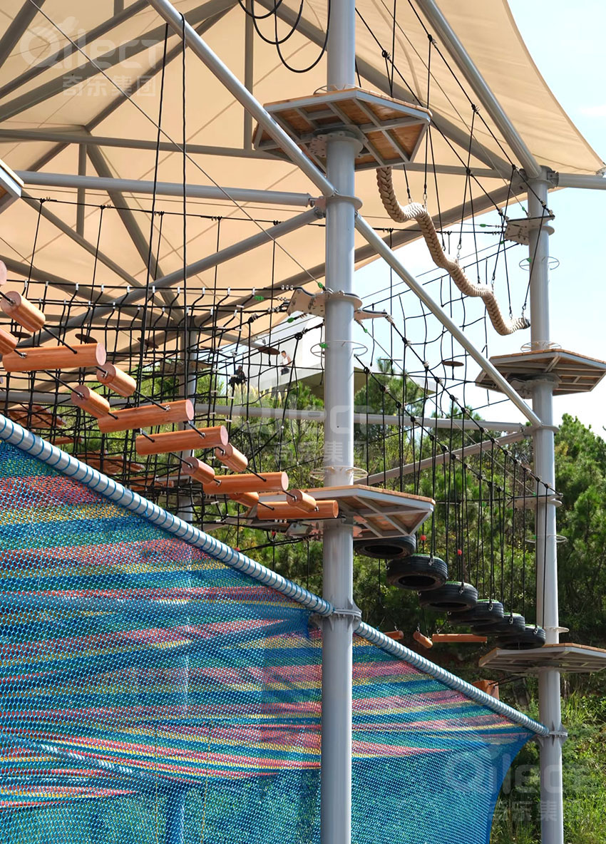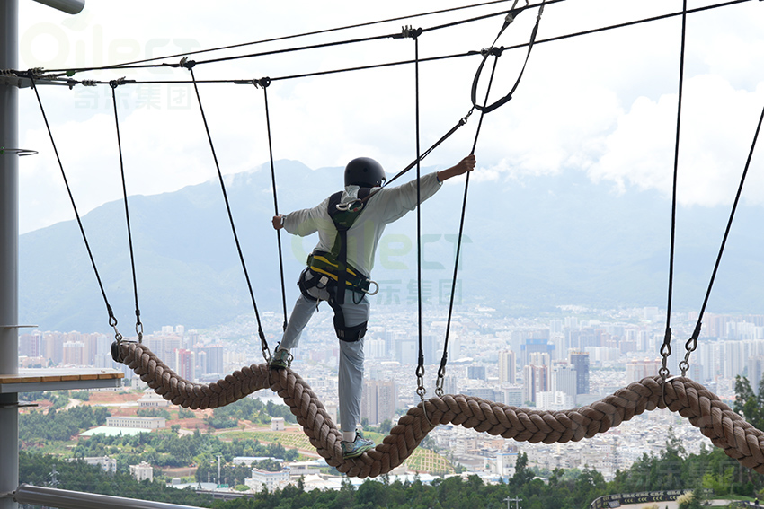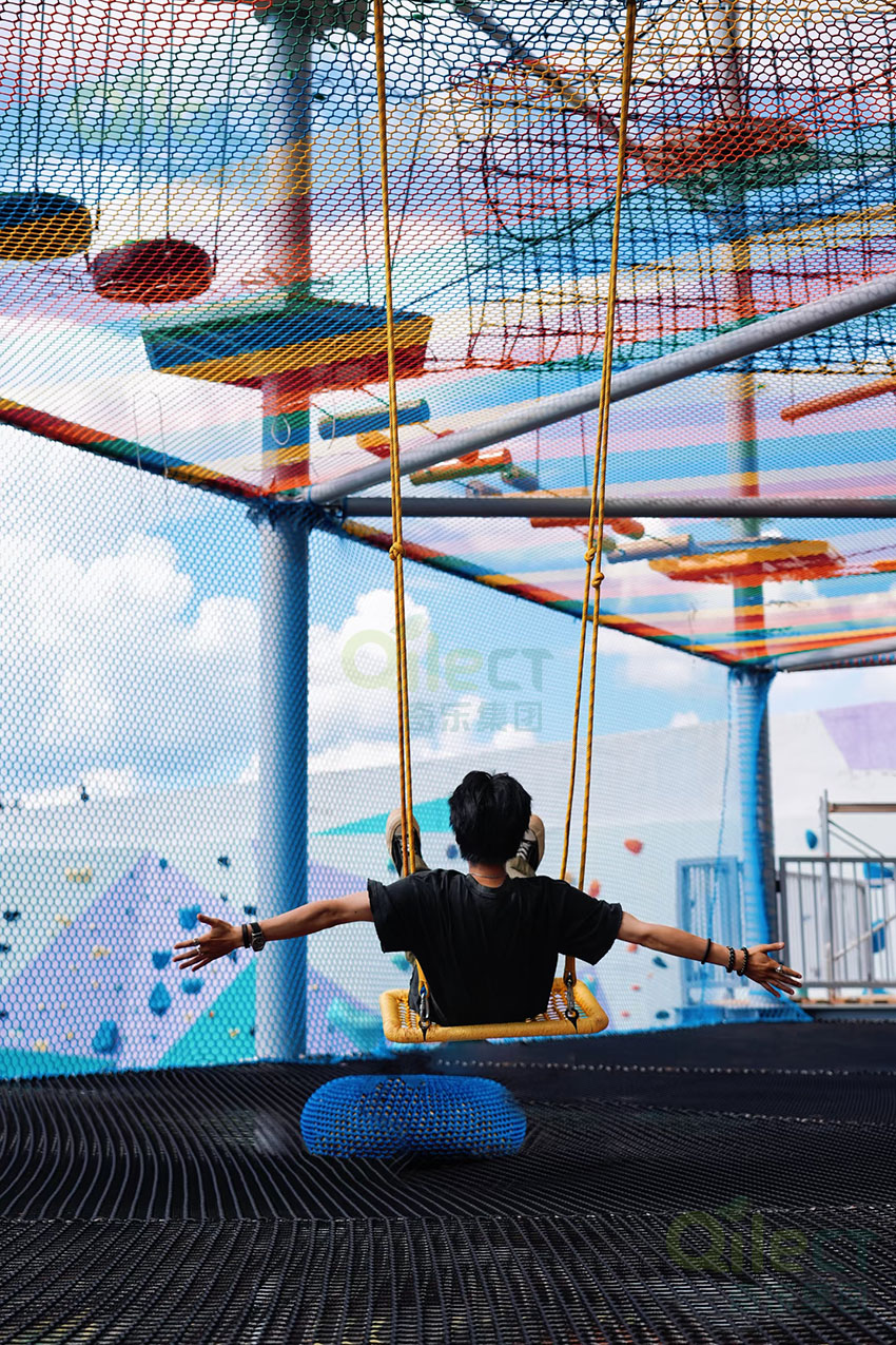 二層設計為一個繩網體驗層+16個拓展步道,輕極限體驗,挑戰難度適中,可以讓挑戰者更好的適應,先培養信心,以便完成更高一層的挑戰。
