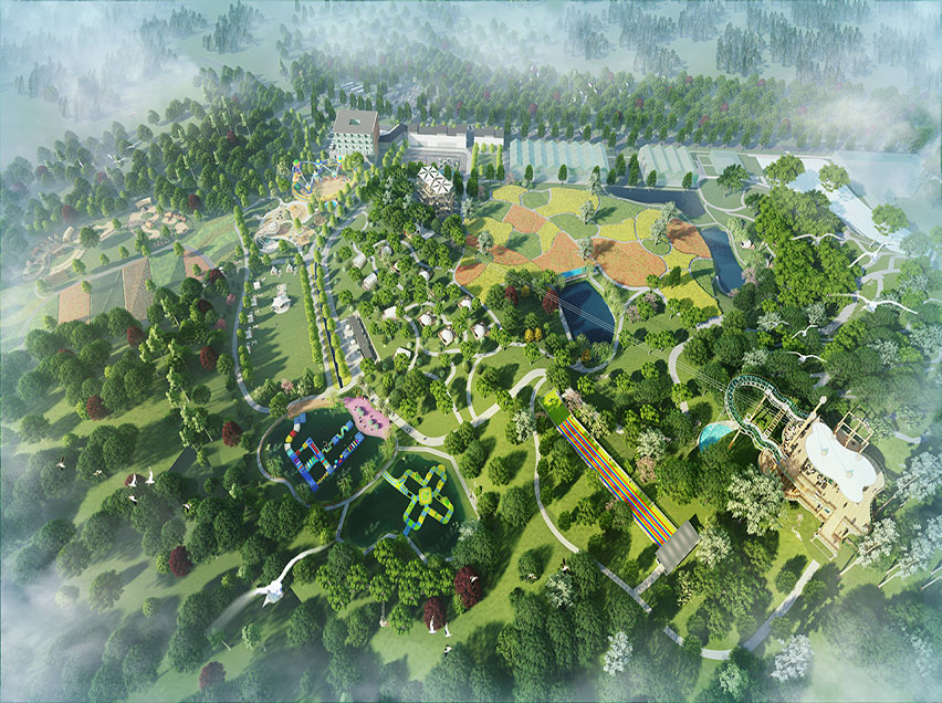 1.項目主要依托山、湖、林、田構(gòu)成的自然景觀,利用原有路網(wǎng)點狀布局休閑游樂項目,通過引進云娛綜合體、鉆石塔、叢林穿越、萌寵樂園、勞動實踐基地等20余個游樂項目。