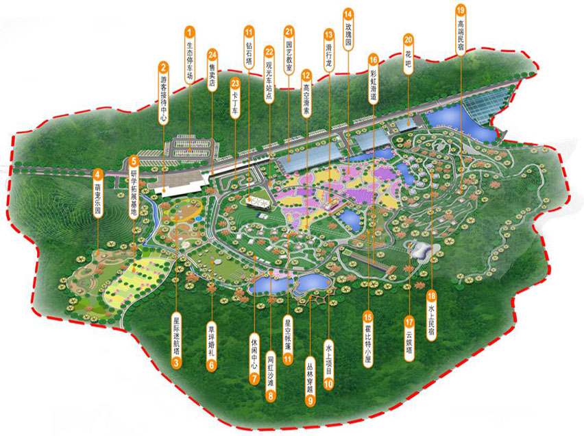 2.本分為游客服務(wù)區(qū)、一期停車場、休閑游樂區(qū)、研學科普區(qū)、花海觀光區(qū)、野奢民宿區(qū)、運動探險區(qū)、二期停車場、山體燈光秀等9個區(qū)。
