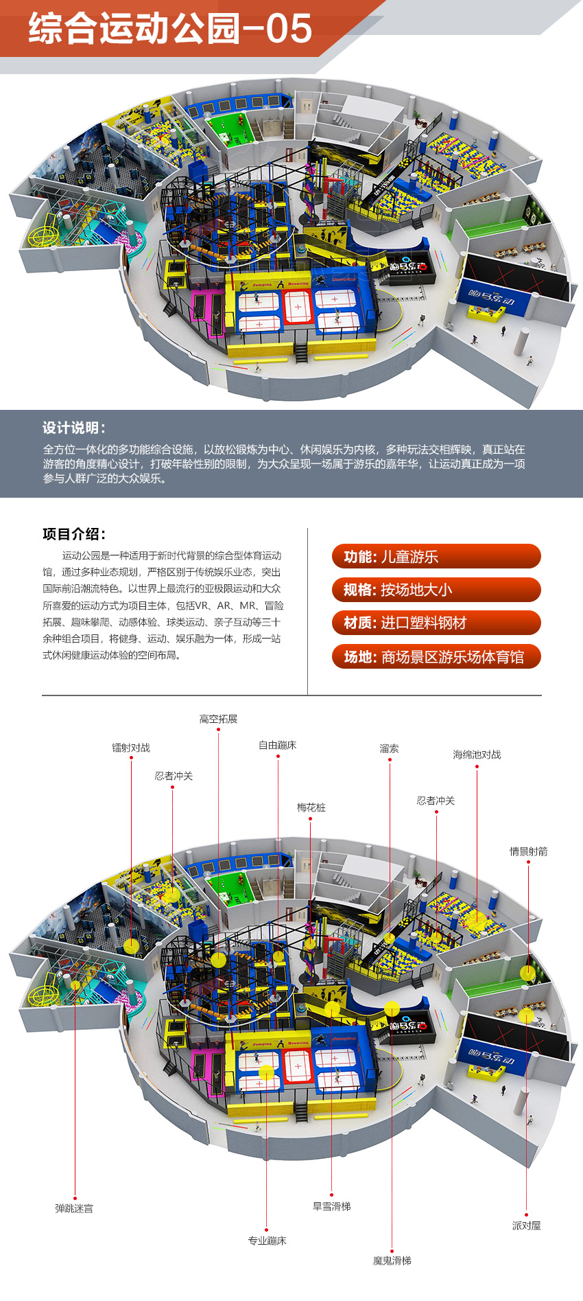 本項目適用于各種親子主題類的樂園,巧妙運用“熊貓”IP造型設計,集拓展、探險、滑道、飛索、蹦極、不銹鋼滑梯、攀巖、爬網等46種不同運動體驗的文化主題項目,結合“大灰熊”IP形象,融入相關設計元素,打造差異化的網紅IP主題性運動拓展營地綜合體。 在裝飾設計上采用竹葉和竹竿的綠色設計元素,以原生態、自然風格為基調,采用原木、繩網和不銹鋼等柔韌度好的生態材料。滿足大眾貼近自然、主題鮮明、寓教于樂的兒童素質訓練教育親子樂園的精神訴求。